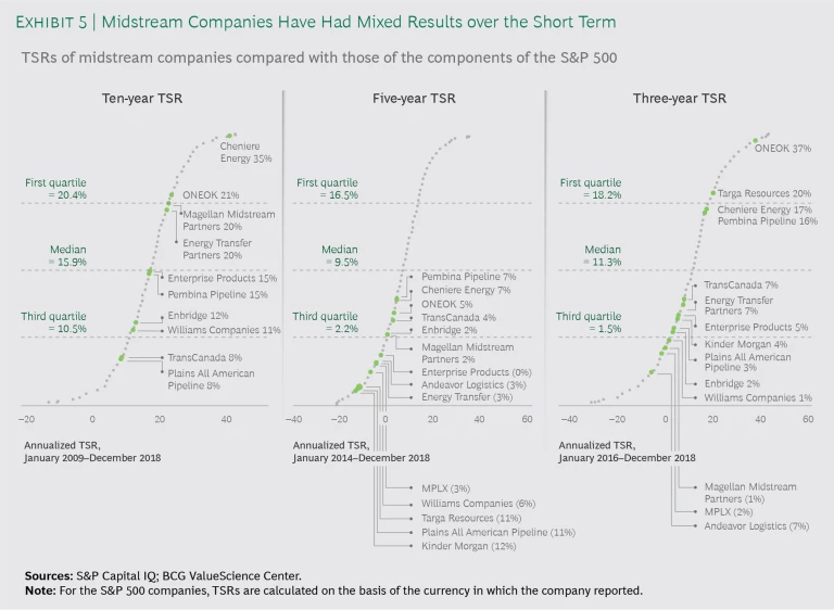 Midstream Companies. A newly added subsector in this year’s report comprises midstream companies, which provide processing, transportation, and storage of oil, natural gas, and natural gas liquids through pipelines and terminals. These businesses had generally strong TSR performance for the ten-year period, but the results of the five-year span were disappointing. The group’s three-year TSR results were mixed: some companies managed to produce strong results, but many companies continued to underperform. (See Exhibit 5)
