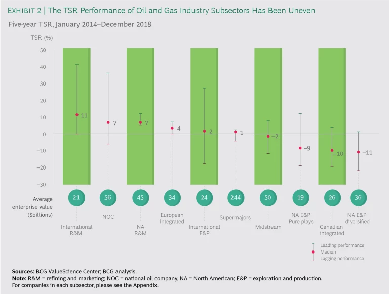 Although, collectively, oil and gas companies have struggled, the TSR performance of the industry’s subsectors has been far from uniform. (See Exhibit 2.) A review of median five-year TSR (that is, the median company’s TSR from the beginning of 2014 through the end of 2018) viewed through the lenses of position in the value chain, company size, and regional exposure or emphasis, reveals a number of noteworthy results. (See “The Companies in Our Sample.”)