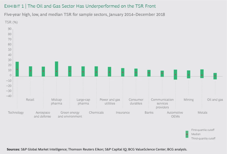 Indeed, among the 33 industries BCG tracks, oil and gas has the worst median five-year TSR. (See Exhibit 1.) And the industry’s share of the S&P 500 Index, which is based on market capitalization, is shrinking.
