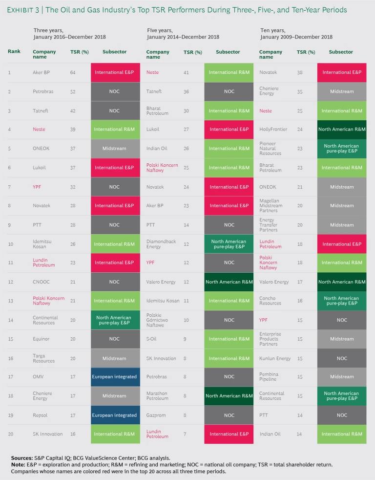 Our study looked at TSR performance over the full ten-year, 2009 through 2018, price cycle. Furthermore, we considered three- and five-year views that provided different lenses on how companies’ performance evolved during and after the oil price downturn. With these intermediate time frames, we were able to look at a larger, more representative industry sample: many of the largest R&M players have emerged since 2010 through corporate breakups, especially in North America.