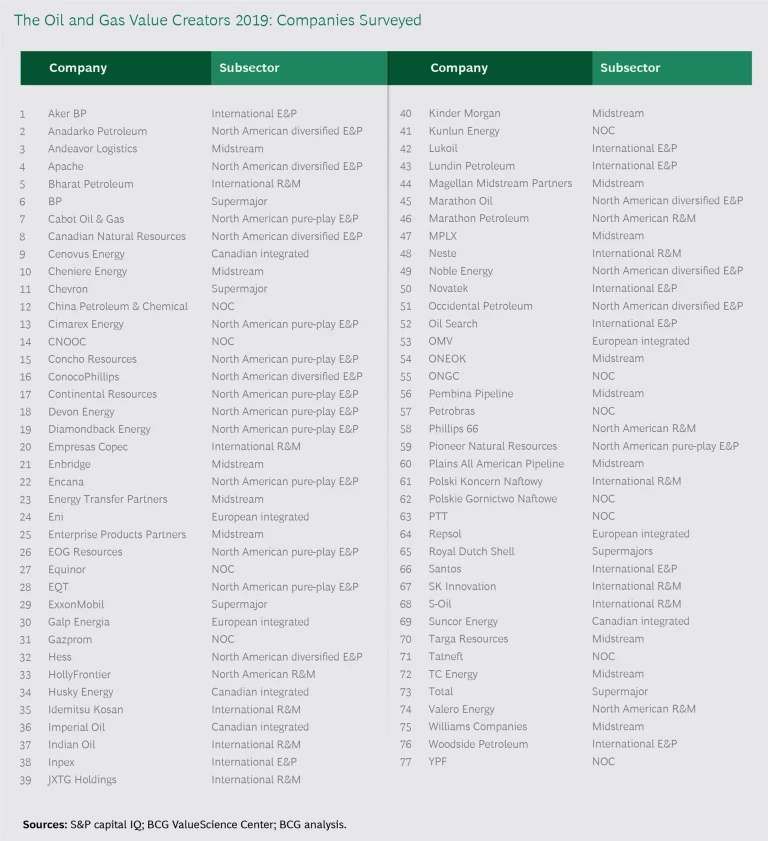 For our 2019 report on value creators in the oil and gas industry, we selected 77 companies from ten peer groups including, for the first time, midstream players. We excluded oilfield services companies.