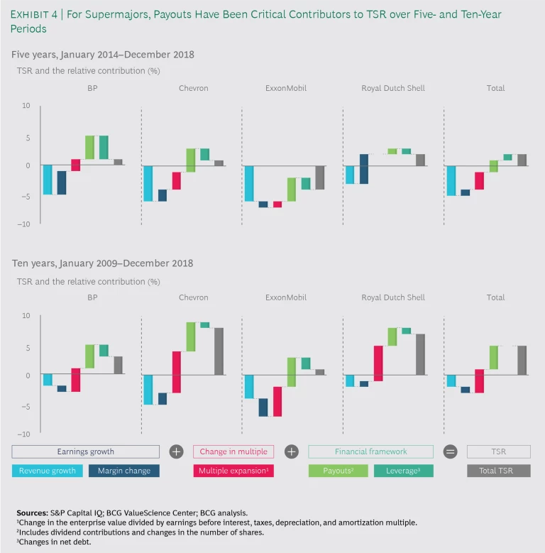 The second defining feature of these companies’ TSR performance is the key role shareholder payouts have played, particularly as earnings have contracted. (See Exhibit 4.) Over the past ten years, the companies collectively spent an average of $56 billion annually on dividends and share buybacks. Royal Dutch Shell, Chevron, and ExxonMobil were particularly aggressive on the dividend front, increasing dividends by a combined 60%. The critical role of payouts in supporting TSRs is unlikely to diminish, particularly given the sustained challenges these companies face in achieving earnings growth.