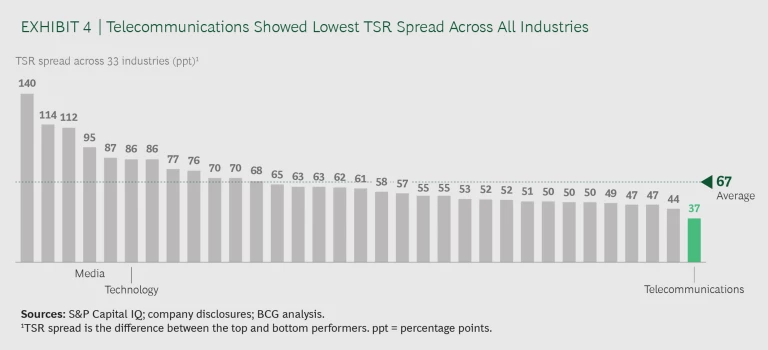 These are not necessarily new lessons. But they are urgent. In addition to having bottom-quartile TSR, telecommunications had the lowest spread between top and bottom performers among the 33 analyzed industries, an indication that investors do not detect much difference among operators in their pursuit of risk-averse, in-country fiber and 5G strategies. (See Exhibit 4.) At this point, relying on a business-as-usual approach will not cut it. Operators need to be willing to take risks.