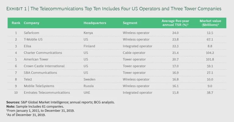 What does it mean that three of the highest-return telecom companies over the past five years are not real telecom companies? Could there be any clearer signal that the industry is under the sway of fundamental transformation than the fact that three tower companies—companies that own passive telecom infrastructure—generated higher shareholder returns from 2015 to 2019 than almost all operators? (See Exhibit 1.)
