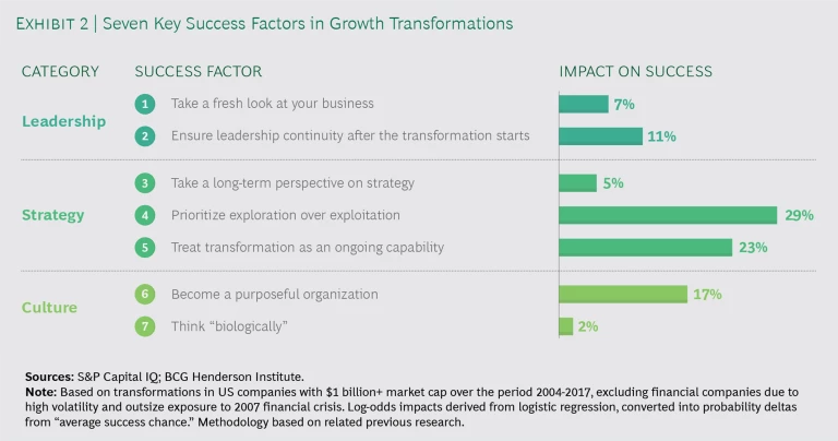 Given the long odds of success for growth transformations, it is important to understand what can be done to improve them. The seven factors that we identified as characterizing successful growth transformations in a measurable way span the categories of leadership, strategy, and culture. (See Exhibit 2.)
