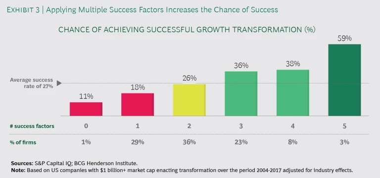 Each of the seven factors we’ve just described can individually improve the chances of success. But their effects are additive: companies that applied more factors had a correspondingly higher chance of successfully accelerating growth and achieving TSR outperformance—rising from 11% for companies with none of the factors to 59% for the small minority that applied five factors. (See Exhibit 3.)
