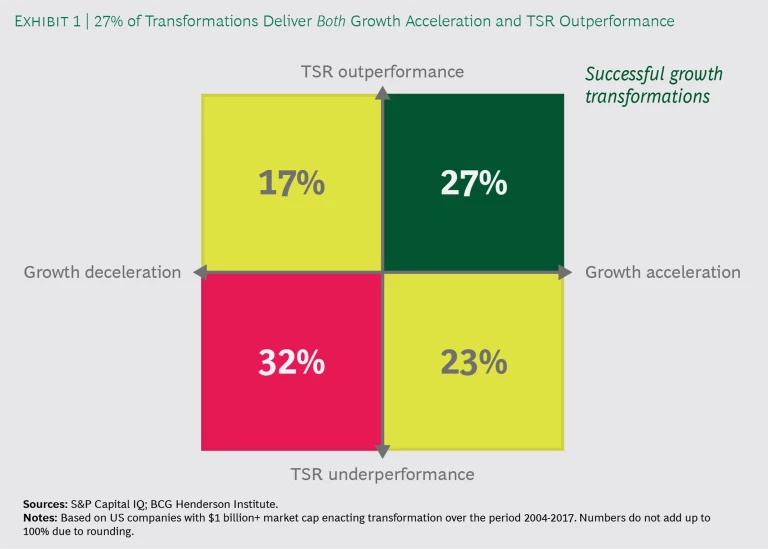 Transforming for growth is difficult; only 27% of the transformations in our sample were successful. (See Exhibit 1.) It is hard because companies need to grow in a way that also creates shareholder value: 23% of transformations actually managed to accelerate growth but failed to generate TSRO. Those that were successful, however, generated significant value—11 percentage points more growth acceleration and 12 percentage points more TSRO than an “average” transformation.