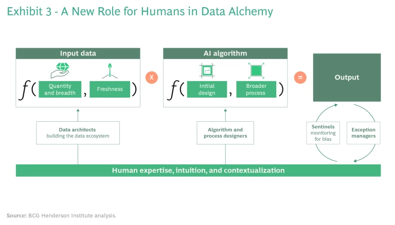 When AI is introduced, concerns often arise regarding the implications for people. Exhibit 3 depicts the function of human decision makers in the data alchemy equation. People play four critical roles: building the data ecosystem, designing the algorithm and the process around it, selectively monitoring the output for bias and other anomalies, and managing exceptions flagged by the system.