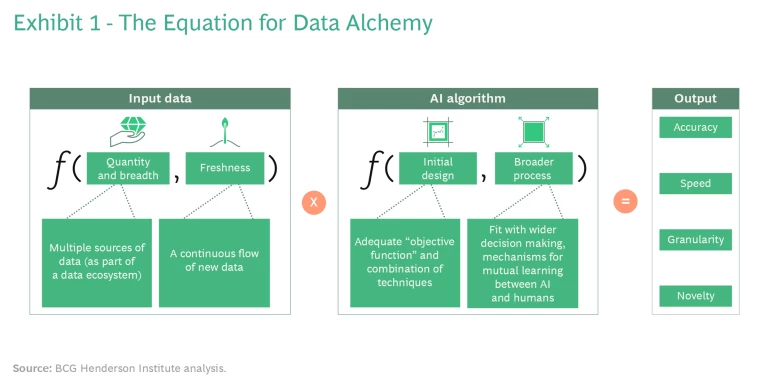 Although the sweep of change may not yet be evident on a broad scale, it is visible within many companies as they adjust the way they apply analytics. This practice of data alchemy can be summed up in a simple equation with two main components that combine to produce positive decision outcomes, as illustrated in Exhibit 1.
