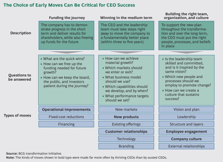 - Strategic Moves: the few game-changing choices made by the CEO, during his or her early tenure, to mobilize and strengthen the company for future growth. A wide range of moves is routinely available to CEOs. (See the exhibit, “The Choice of Early Moves Can Be Critical for CEO Success.”) A few of these, it turned out, were adopted far more often by thriving CEOs than by ousted CEOs, and appear to be conducive to superior performance.
