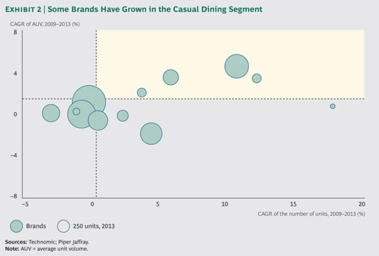 A drawback of segment-wide analysis is that it can conceal significant variations in performance among individual brands and companies. And indeed, in the CDR segment from 2009 through 2013, several brands outperformed, increasing both their unit count and their AUV. (See Exhibit 2.) There was a spread of 35 percentage points in 2013 ROGI among CDR brands, with the leaders producing returns ranging from 35 to 40 percent. Similarly, the segment had a variation in annualized TSR from 2009 through 2013 of 45 percentage points, and several companies delivered annual returns of more than 35 percent.