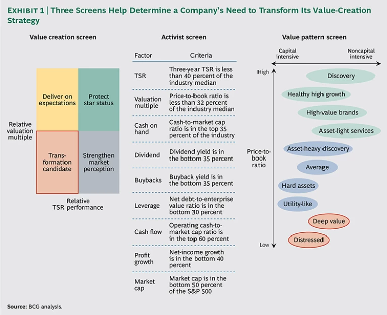 We developed the activist screen in Exhibit 1 in response to the increased activity on the part of so-called activist investors in recent years. (See “Do-It-Yourself Activism,” BCG article, February 2014.) We analyzed the performance of U.S. companies that have attracted an activist investor campaign and identified the critical thresholds across nine metrics that increase the odds that a company will face an activist campaign. So, for example, activists tend to target companies whose TSR over a three-year period is less than 40 percent of the industry median, whose valuation multiple is in the lower third of its sector, and whose cash on hand is roughly in the top third. If a company meets these criteria, along with the others in the activist screen, its senior executives should be thinking about transforming its value-creation strategy—before some activist investor does it for them.