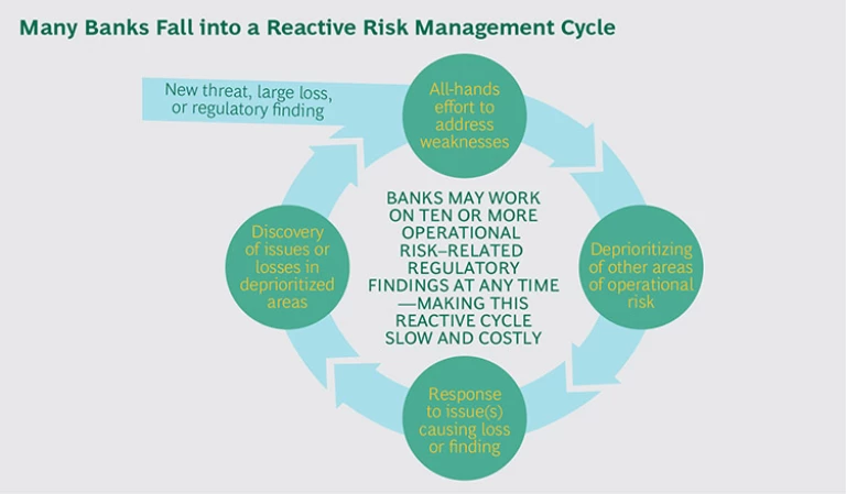 Over the course of several months, we conducted extensive interviews with executives and operational risk teams within the traditional second line of defense or oversight role, and within the operating businesses themselves. The results indicate that many banks find themselves in a reactive cycle in which discovery of a new threat, loss, or regulatory finding leads to an all-hands effort to address weaknesses—an effort that usually entails adopting a resource-intensive point-solution that draws people and attention away from other important or new operational risks. (See the exhibit.)