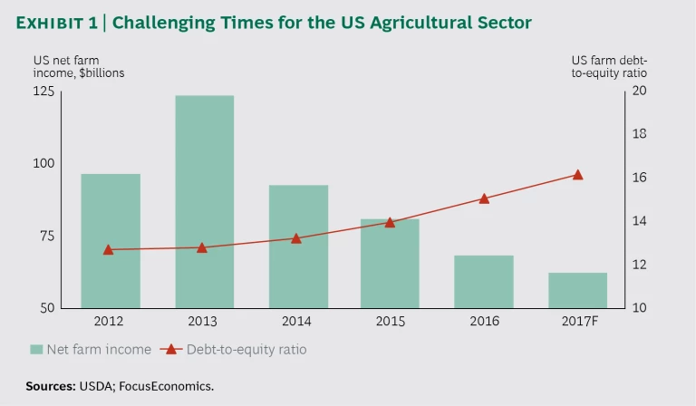 These challenges come at a time when the agriculture industry is already treading water. With most commodity prices at all-time lows, many farmers are continuing to experience net operating losses and rising debt levels. As a result, the farm debt-to-equity ratio has reached its highest point in the past five years. (See Exhibit 1.)