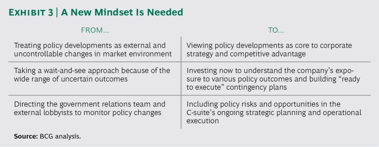 For this reason, nothing less than a wholesale shift in mindset is in order. (See Exhibit 3.) Agribusiness companies need to stop treating administration policies only as public relations issues and start treating them as a critical part of the business agenda. They need to develop a comprehensive strategic response with the same rigor that a 20% change in the price of corn would require.