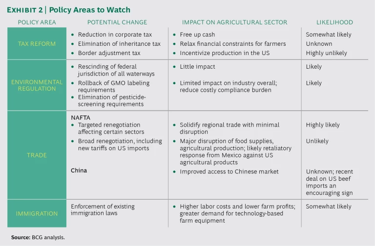 By our assessment, potential changes in four policy areas are especially important. They vary both in their probability and in their potential impact on the agricultural sector. (See Exhibit 2.)