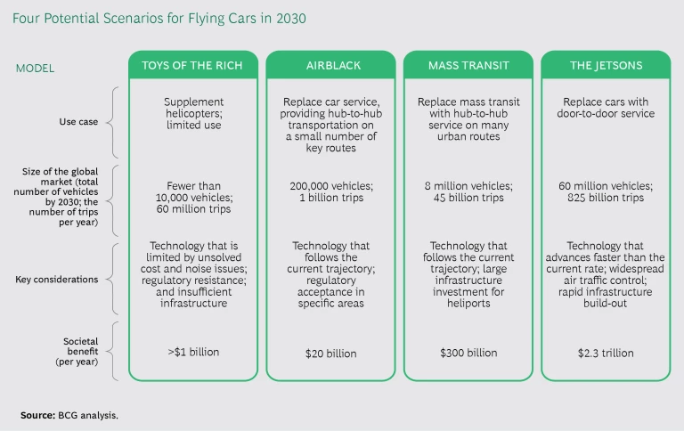 The ultimate market size is still unclear and will depend on the economics of the technology and how regulatory issues (relating to such concerns as airspace, noise, and the ability to build support infrastructure) pan out. We anticipate four potential scenarios by 2030. (See the exhibit.)