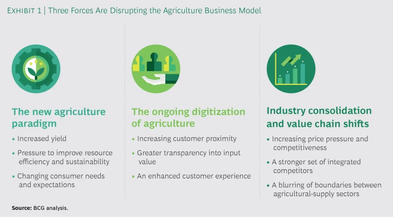 Three interrelated factors are transforming the environment in which agricultural-input suppliers conduct business: the changing agriculture paradigm, increasing industry consolidation with value chain shifts, and digitization. (See Exhibit 1.)