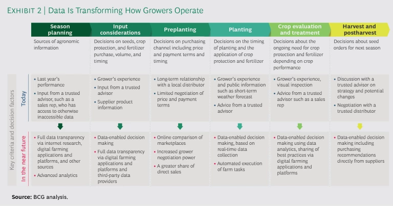 The forces affecting the business of agriculture are already transforming how farmers conduct their seasonal activities. At every step of their seasonal journey—from preseason planning to planting to mid-season crop evaluation to harvesting and planning for the next season—growers are taking advantage of better data on weather, climate, location technology, soil and crop conditions, pricing, distribution, and retailer and customer demands. In response, agricultural-input suppliers are rethinking how to support farmers’ efforts to balance yield, resource management, and consumer expectations. (See Exhibit 2.)