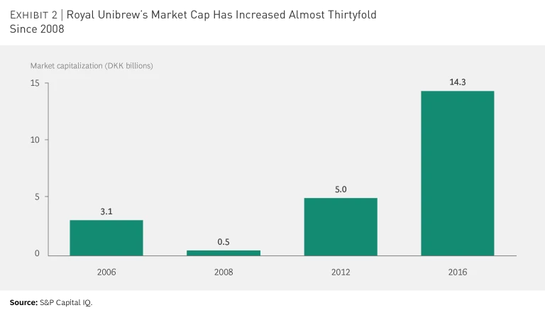 Royal Unibrew’s performance results clearly suggest the staying power of its turnaround strategy. By 2016, its market cap hit DKK 14.3 billion, almost triple the figure for 2012 and almost 30 times that for 2008. (See Exhibit 2.)