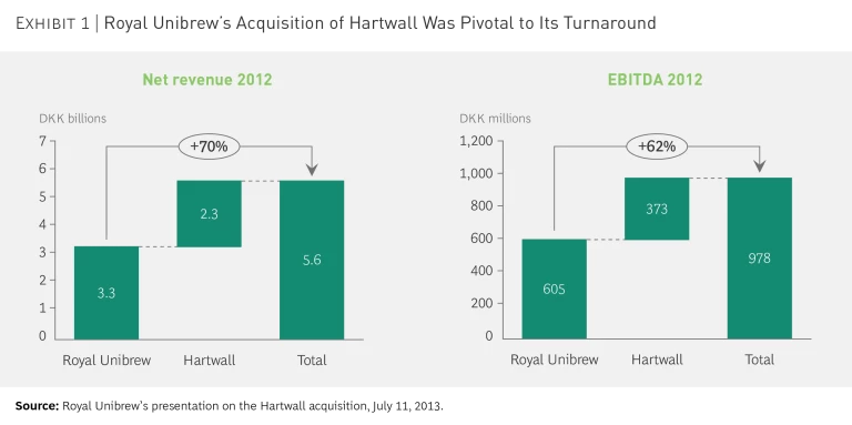 By 2013, Royal Unibrew had stabilized and was ready to accelerate growth—this time, with the acquisition of Hartwall, the number-two beer producer in Finland. The Hartwall acquisition was nothing like the doomed Polish ones. Although Hartwall had seen minor market share decline in recent years, it was a strong company in its own right, founded in the early 19th century and independently owned until 2002. Its Original Long Drink, introduced in 1952 at the Helsinki Olympics, remains Finland’s most popular bottled mixed drink. Formerly owned by Heineken Group, Hartwall was also Finland’s top seller of mineral water, cider, and ready-to-drink beverages (including “alcopops”) and the country’s number-two seller of soft drinks and energy drinks. The Hartwall acquisition gave Royal Unibrew an immediate lift, increasing the company’s revenues in one year by 70% and its EBITDA by more than 60%. (See Exhibit 1.)