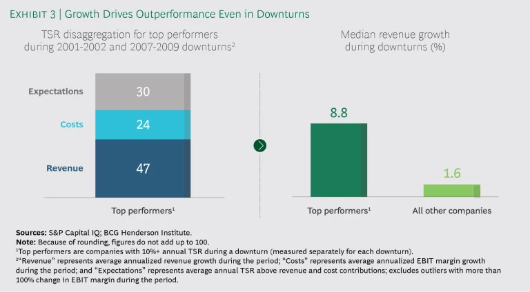7. Invest in growth engines. Defensive actions may be necessary for some companies to survive the downturn—but to thrive, leaders need also to consider the top line. In the last two downturns, the most successful companies did indeed pursue efficiencies, improving their profit margins. 3 3 Companies that achieved 10%+ annualized TSR in the 2001–2002 or 2007–2009 downturn. But revenue growth was the largest driver of their performance, accounting for nearly 50% of TSR (twice as much as the impact from cost reductions). (See Exhibit 3.)