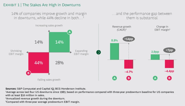 The competitive stakes in downturns are high. In the last four downturns, an average of 14% of companies increased both their sales growth rate and EBIT margin despite the challenging circumstances. During downturns, those companies grew revenue by 14 percentage points more and improved their EBIT margin by 7 points more than the 44% of companies that declined in both metrics. (See Exhibit 1.)