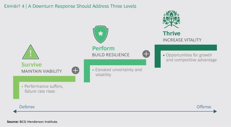 10. Structure your downturn response across three levels. To prepare for a downturn, leaders should consider their response across three levels ranging from defensive to offensive moves. The focus necessary on each level may depend on the company’s specific situation, but those that come out of a downturn strongest will have addressed all three in their preparation and response. (See Exhibit 4.)