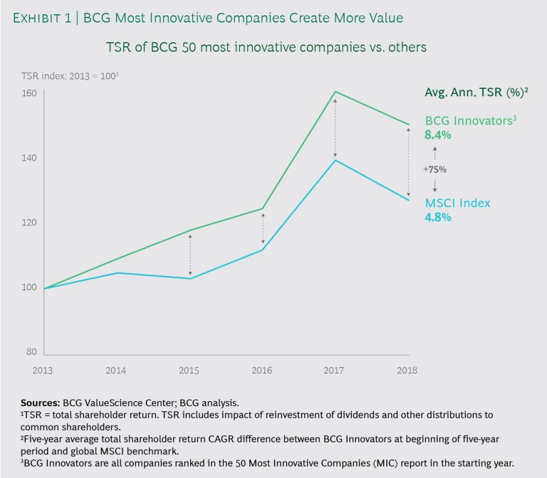 Innovation is more important than ever. Mature markets, shorter product lifecycles, the importance of growth to long-term shareholder value—these all put a premium on the ability to invent new business models, products, services, and processes. Digital technologies both raise the stakes and accelerate the pace by expanding the horizon of the possible. And history shows that innovators outperform others. Innovative companies on average generate annual total shareholder returns that are 3.6 percentage points higher than those of their peers. (See Exhibit 1.)