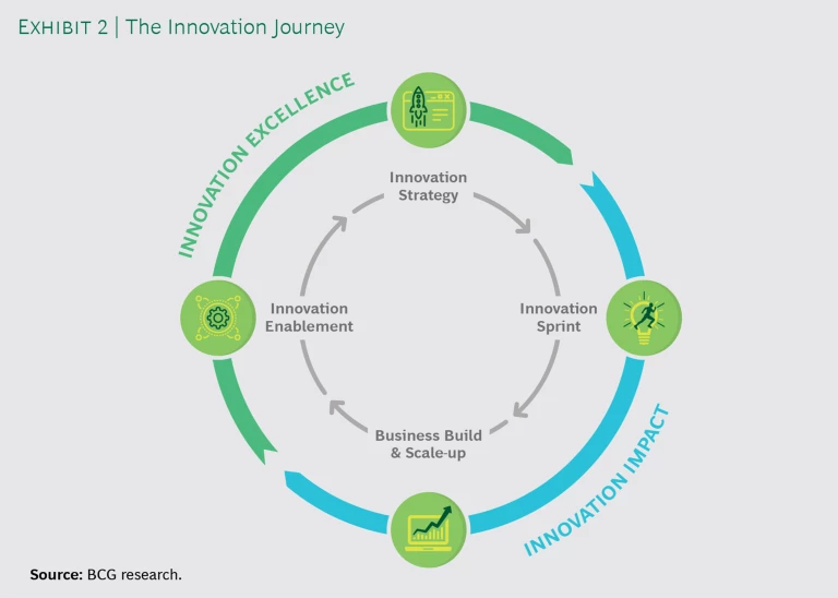 Leading companies see innovation as a journey that needs to be managed systematically, on multiple dimensions, to drive excellence and impact. (See Exhibit 2.) Innovation strategy, regularly reviewed, sets direction and brings any disruption to the surface. Successive innovation sprints provide the opportunity to “test and learn” from failure and MVPs. Business build and scale up maximize the returns on the most promising inventions. And innovation enablement ensures that companies have the right capabilities to keep up with changing markets.