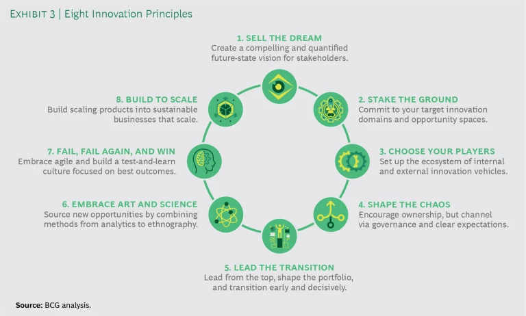 BCG’s eight innovation principles keep the journey moving. (See Exhibit 3.) Each principle on its own might seem easy to implement. Indeed, many innovators follow some—but rarely all—in a best-in-class fashion, since all take time to develop and implement. Therein, often, lies the crux of failure. Top innovators understand that the journey never ends—the point is to keep moving forward, reaping the rewards as you go.