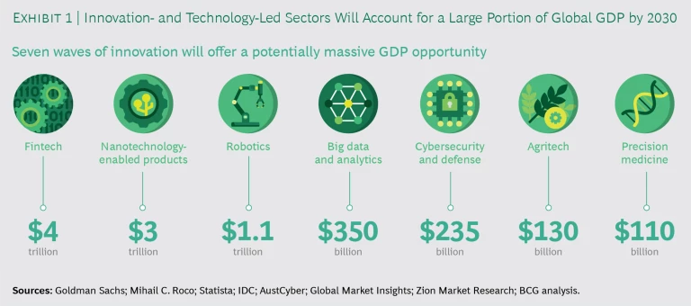 The ability of nations to innovate is becoming ever more critical. Digital technology and disruptive business models are transforming industry after industry, shifting economic growth to new sectors. By 2030, fintech, nanotechnology-enabled products, robotics, big data and analytics, cybersecurity and defense, agritech, and precision medicine could collectively account for nearly $9 trillion in output worldwide. (See Exhibit 1.) The world’s advanced economies are again likely to dominate this next wave of technology-based industries. In addition to these likely winners, China and India—which are already leveraging their deep pools of technical talent and massive domestic markets to become players in digital industries—are in a strong position to serve as engines of innovation, investment, and wealth creation.