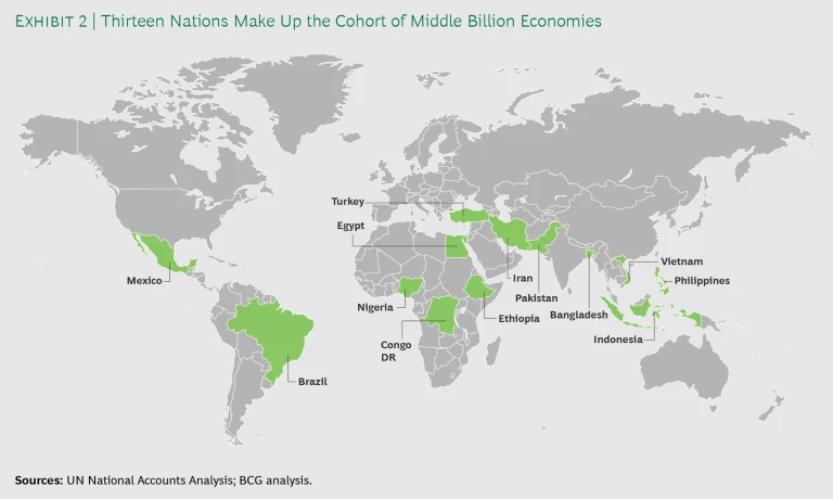 Where does this leave the rest of the developing world? We are especially interested in a cohort of 13 economies that we call the Middle Billion—nations other than China and India (which, owing to their enormous scale, are special cases) that have nominal per-capita GDPs of less than $10,000 and that will have close to or more than 100 million people by 2030. We will focus on three Middle Billion economies—Indonesia, the Philippines, and Vietnam—that account for nearly three-quarters of the population of Southeast Asia. Other Middle Billion economies are Bangladesh, Brazil, Democratic Republic of the Congo, Egypt, Ethiopia, Iran, Mexico, Nigeria, Pakistan, and Turkey. (See Exhibit 2.)