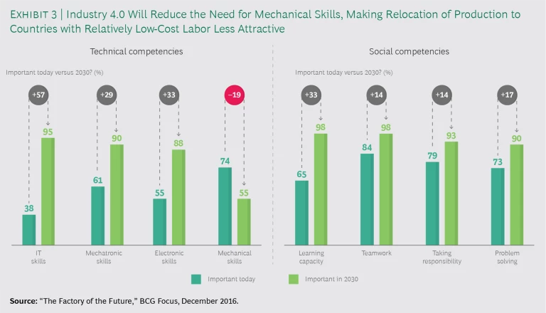 Many lessons from these notable transitions remain relevant for Middle Billion countries, but they may not be universally applicable. The manufacturing-led paths of South Korea, Singapore, and China, for example, required many years of massive investment and targeted, technology-intensive manufacturing to serve as steppingstones, and they were predicated on the assumption of continuing strong growth in global trade of manufactured goods. In today’s new global economy, which digital technology and economic nationalism are rapidly defining, growth in global trade and FDI has slowed dramatically. Industry 4.0 advanced manufacturing systems, such as autonomous robots and 3D printing, are making knowledge and proximity to markets bigger factors than labor costs in determining where companies locate their production. A Boston Consulting Group global survey also found that production managers expect factors such as IT, learning capacity, problem solving, and mechatronic skills to become more important in factories of the future, while they expect the value of mechanical skills to decline. (See Exhibit 3.) At the same time, productivity growth, which has not kept pace with rising costs in key emerging markets, is altering the economics of global manufacturing.