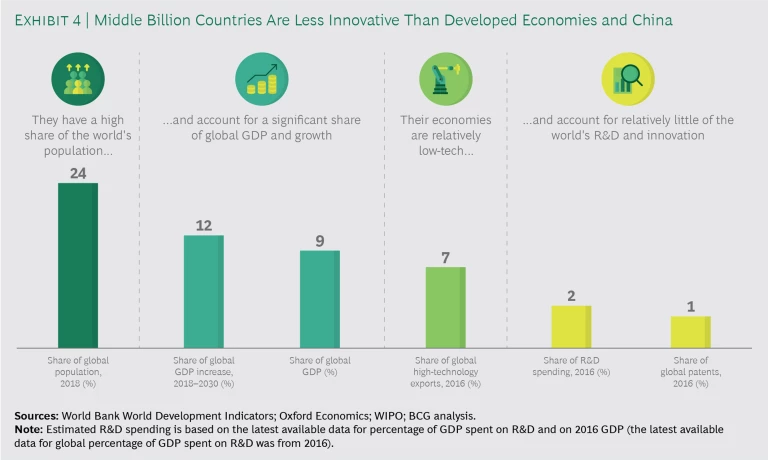 Given that the ability to foster, adopt, and adapt innovation is likely to play an increasing role in the development of Middle Billion countries, it makes sense to look briefly at their legacy performance. And here, if one uses conventional metrics such as R&D spending and patent production, the track record is not encouraging. Middle Billion nations account for 24% of the world’s population and 9% of its GDP, yet they generate only about 2% of global R&D spending and 1% of patent grants. (See Exhibit 4.)