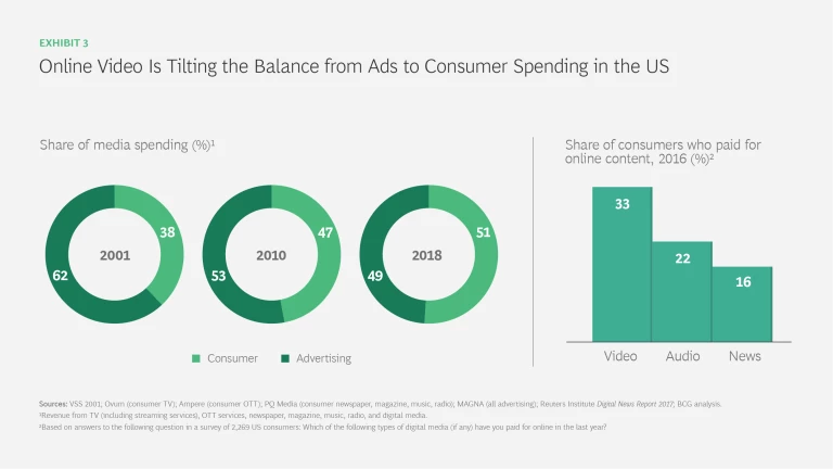 Collecting money from consumers is easier for some companies than for others. US media companies now collectively take in more money from consumers than from advertisers. But consumers have shown a much greater willingness to pay for video or audio content—through Netflix or Spotify, for example—than for news. (See Exhibit 3.) That helps explain why traditional news organizations have rarely appeared on our top-ten lists in recent years. Others have been making progress, however. The New York Times, for example, has more than 3 million digital subscribers; by the end of 2018, despite the market selloff, the company’s stock had doubled from its low in October 2016.