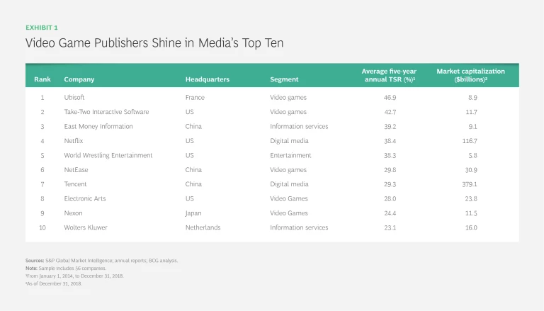 What’s also noteworthy is that the top-performing companies in the industry are not traditional news or entertainment media companies. Five video game publishers, including the top two performers, Ubisoft Entertainment of France and Take-Two Interactive Software of the US, made the top-ten list, as did three companies from China—a game publisher, a financial services information provider, and online giant Tencent. (See Exhibit 1.) Just five years ago, on the other hand, seven of the top ten performers were more traditional media companies, such as ProSiebenSat.1 Media, a German broadcaster and pay TV provider; CBS, a US broadcaster; and Schibsted Media Group, a Nordic newspaper publisher.
