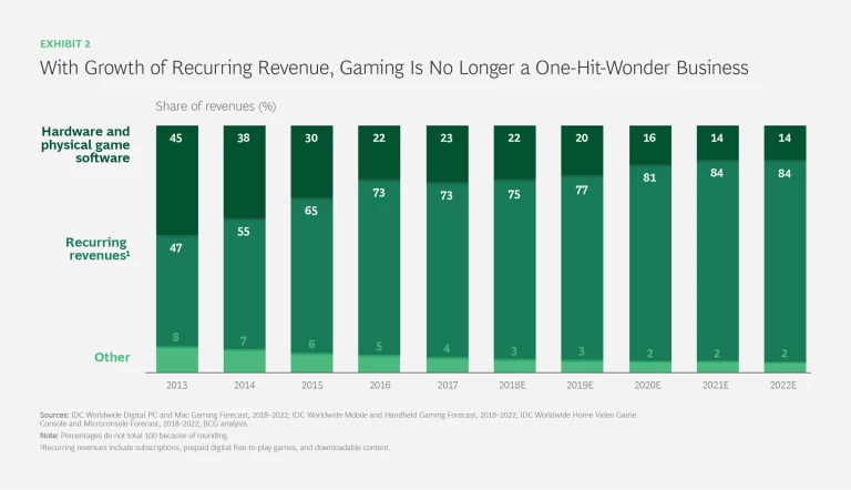 Game publishers have traditionally relied on unpredictable sales of individual software titles rather than ads. In recent years, they have matured from this hit-driven model to more sustainable businesses. (See Exhibit 2.) Nexon, the number-nine media value creator and a new member of the top ten, has relied on recurring revenue from consumers since its inception. The other four gaming companies in the top ten, which were top-ten performers in 2013–2017 as well, reported big boosts in revenue from in-game spending and other forms of recurring revenue.