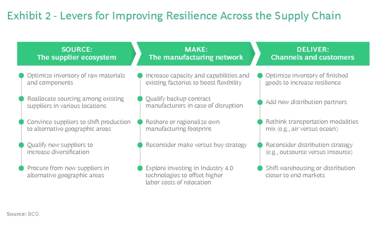 - Make. Companies can evaluate their manufacturing resilience by looking at the percentage of capacity concentrated in certain countries, the amount of production that is outsourced, and whether they have backup production capacity at existing locations in case of contingencies or qualified backup facilities in different locations.