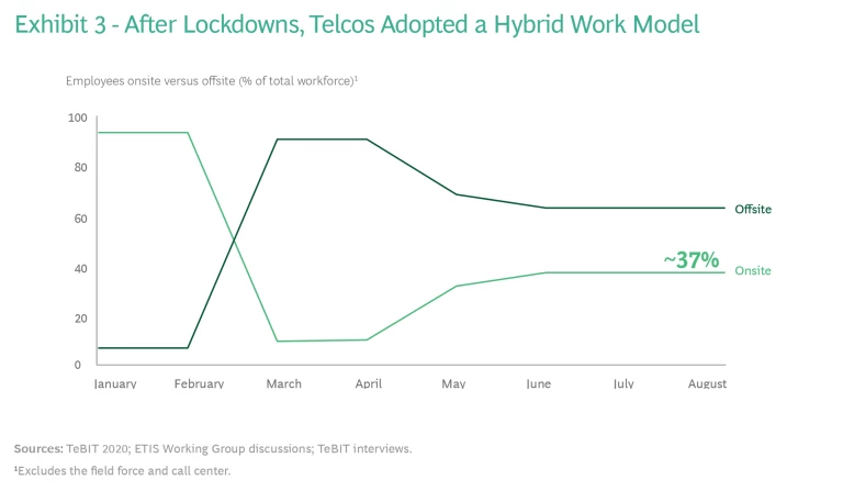 It’s especially important to perfect remote working, as it’s likely here to stay, in one form or another. After the initial lockdown, many telcos shifted to a hybrid model, and much of their workforce is still working remotely. Looking at data from operators participating in TeBIT or in ETIS working groups, we found that telcos had, on average, just 37% of their workforce onsite in August. (See Exhibit 3.)