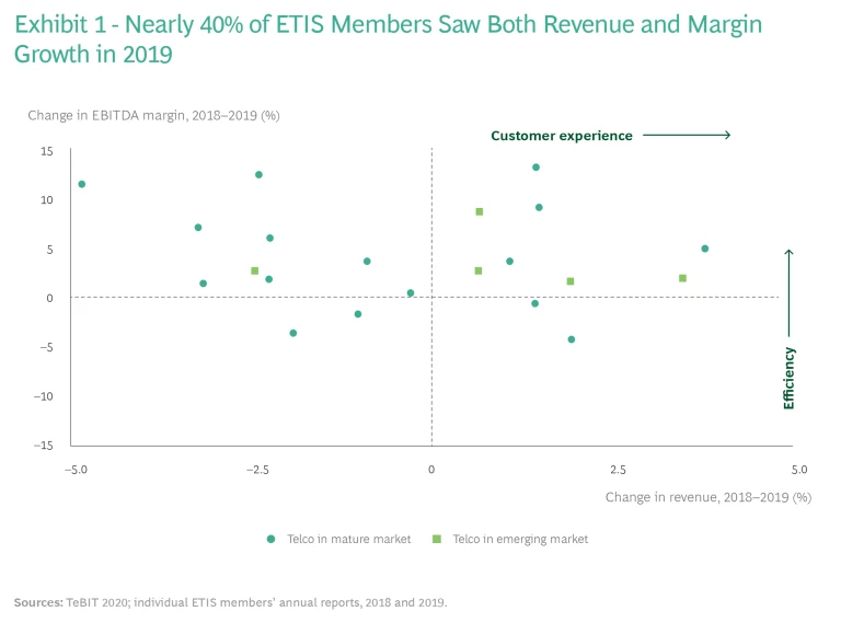 Going into 2020, telcos appeared to be holding steady in the face of familiar challenges, such as competition from over-the-top players, price pressure, and the increasing commoditization of their traditional fixed and mobile offerings. On average, ETIS members saw just a 0.3% drop in revenues for 2019 while TeBIT participants notched a hair of a gain with a 0.2% increase. And improvements in customer experience and efficiency, driven largely by digitization, appeared to be paying off: even in a challenging market, 38% of ETIS members were able to increase revenues and EBITDA margin. (See Exhibit 1.)