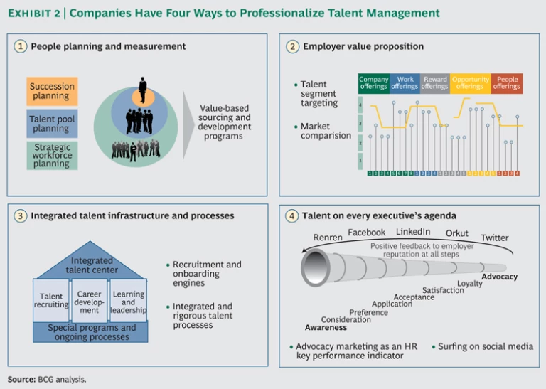 No major company would dream of launching a product without a detailed plan, resources allocated for product distribution, and a marketing campaign. Likewise, talent management should be professionalized along several dimensions. (See Exhibit 2.)