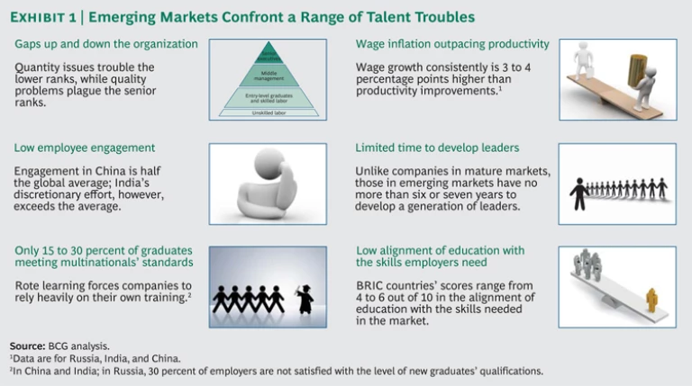 Companies competing in emerging markets—whether they are multinational or locally based—will, therefore, need to raise their investment in talent management, treating human capital with the same rigor as a capital asset investment in order to overcome some common challenges. (See Exhibit 1.)