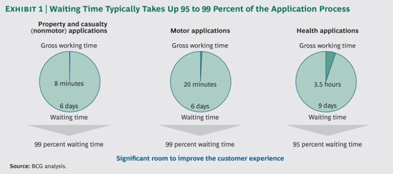 It is therefore no surprise that almost all insurance companies have launched optimization programs under the heading of “lean” in recent years. But it is also little wonder that these efforts have achieved varying degrees of success. The fact is that many insurance companies are still spending a great deal more than necessary, and the costs are adding up as duplication of effort and reliance on manual processes cause mistakes and increase processing times. According to our analysis, this type of waste constitutes up to 30 percent of non-value-creating work and can climb as high as 80 percent in extreme cases. Waiting time typically consumes at least 95 percent of application processes. (See Exhibit 1.) In the case of property and casualty (nonmotor) policies, that equates to eight minutes of actual working time every six days. The shortcomings often stem from lack of scope and input. For instance, many companies elect to optimize single processes or departments. In very few cases do they evaluate and improve their processes on the basis of customer perspectives and with lean principles integrated throughout the organization.