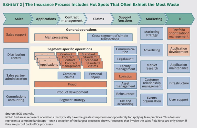 Where do we start? Nothing is as convincing as concrete results when it comes to establishing internal support for lean efforts. Pilot projects are a recommended way to demonstrate the advantages of a Lean 2.0 program and build momentum for further action. The processes picked for pilot treatment should cover multiple organizational units to demonstrate the overall effect of lean processes. They should also be highly relevant to the organization—meaning they exhibit high frequency and capacity, such as those supporting claims—and they should show the potential for savings barring any IT investment. While each pilot should be tailored to the company’s specific needs, there are typical “hot spots” of waste in insurance companies that are ripe targets for pilot programs. (See Exhibit 2.)