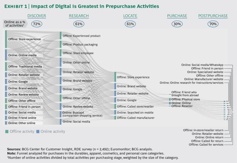 Digital technologies affect each stage of the purchasing journey—prepurchase, purchase, and postpurchase—differently. But along this route, marketers and retailers are looking at big changes in how and where people buy, shifts that will evolve over the next several years. So far, the Internet’s impact is most extensive and powerful in the pre- and postpurchase stages. (See Exhibit 1.) With online activities playing a role in almost three-quarters of all product discovery activities and in nearly two-thirds of all research activities, the Internet is substantially altering consumer behavior, making the various phases of prepurchase much more complex and the overall consumer journey harder to predict. Moreover, with more than 70 million Facebook users, Brazil is the social network’s third-largest market by number of users, and consumers’ opinions postpurchase—whether positive or negative—often have a wide audience.