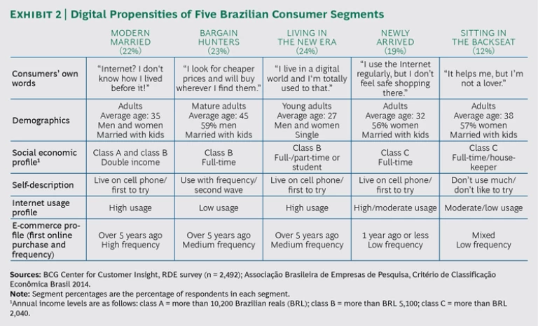 BCG’s research, which included both a quantitative survey of some 2,500 Brazilians and interviews about their online use, indicates that distinct categories of connected consumers are already taking shape in coastal areas where digital penetration is high. Because these groups are evolving, marketers will likely encounter fluid segments of consumers for the next several years. At the moment, we see five discrete segments based on demographics, occupation and income, extent of digital adoption and usage, and online shopping habits. Each segment has distinctive common characteristics and displays its own particular usage patterns, lifestyle preferences, and online evolutionary path. (See Exhibit 2.) But each is also undergoing its own metamorphosis in size and makeup, and new segments could well emerge.