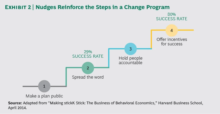 To turn good intentions into real results, define specific actions that could lead to a desired outcome and then design nudges that lead people to take those actions. Nudges can be reinforcing mechanisms that act at select points along a ladder of success. (See Exhibit 2.) Nudges can be tied to making a plan public, spreading the word about it through workplace communication channels, holding people accountable by asking them to check in with someone else when they’ve reached designated milestones, and offering meaningful incentives for achieving the goal. According to research reported in a Harvard Business School publication, change efforts that incorporate the first two steps succeed close to 30% of the time, while programs that include all four have an 80% success rate.1 1 Leslie John, Michael Norton, and Michael Norris, “Making stickK Stick: The Business of Behavioral Economics,” Harvard Business School, April 2014.