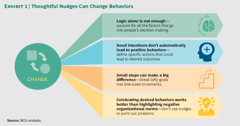From our work with leading organizations, and within BCG itself, we have distilled several lessons for leaders who want to harness the persuasive power of digital nudges to create new behaviors. (See Exhibit 1.)
