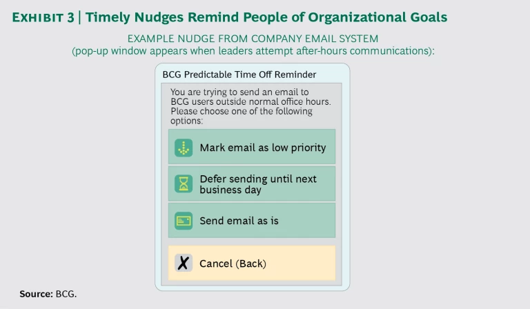 Small steps can make a big difference. People overestimate their ability to change by failing to translate lofty goals into the incremental steps they need to take to get started. Digital nudges can be tied to those smaller commitments. BCG created such a digital nudge as part of an internal directive to be more considerate of employees’ life outside of work, an initiative known as PTO. (See “Making Time Off Predictable—and Required,” Harvard Business Review, October 2009.) The firm recognized that BCG leaders have to reinforce the desired culture through their own behavior. It created a macro in the company email application that causes a pop-up window to appear whenever leaders attempt to send a message after hours. (See Exhibit 3.)